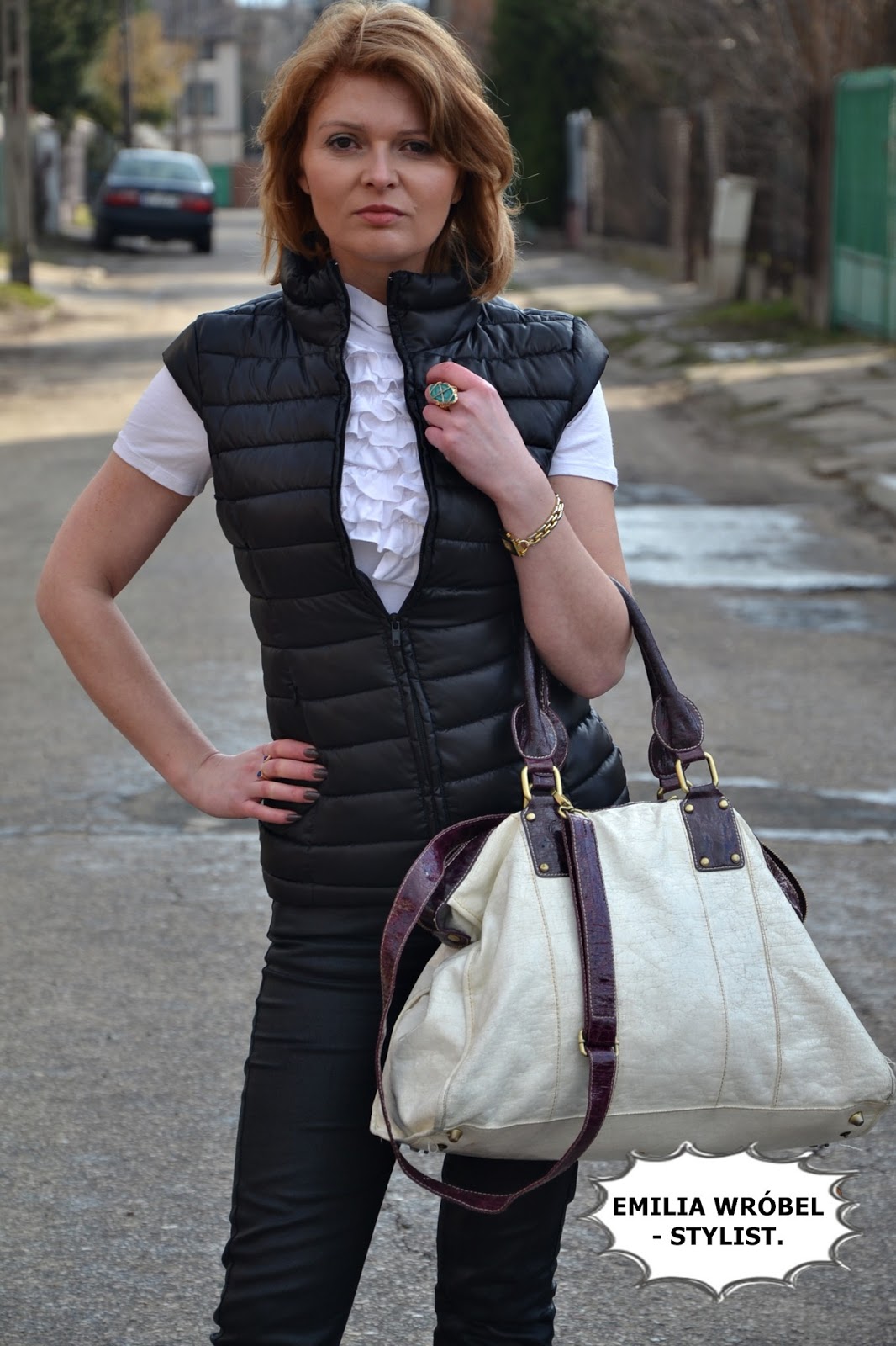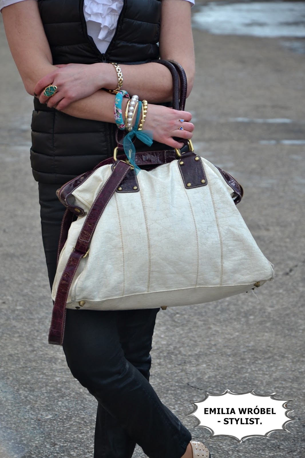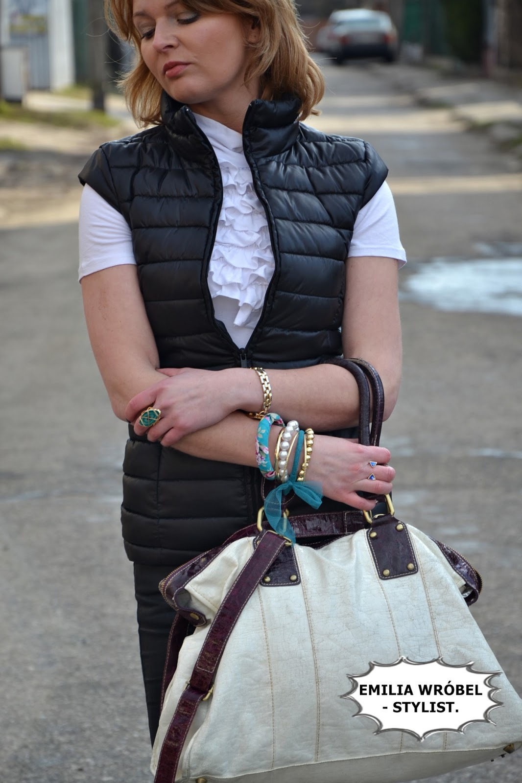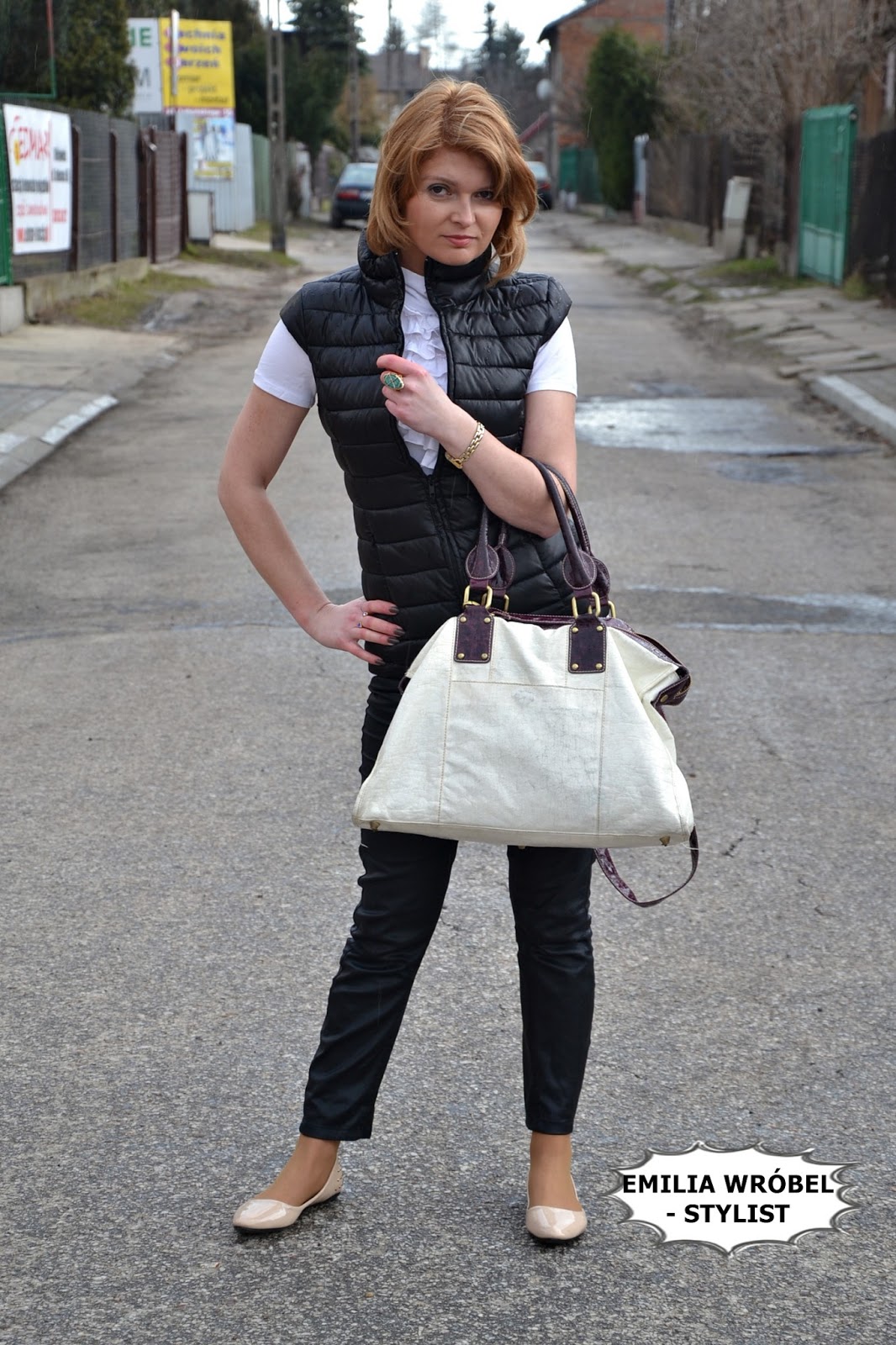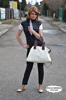 Pikowaną kamizelkę założyłam do białej koszulki z żabotem, do tego skórzane spodnie oraz buty- baleriny z ćwiekami kupione w Mohito. Jako dodatki- wybrałam dużą białą torbę. Biżuteria w kolorze niebieskim, którą mam na sobie rozjaśnia stylizację.